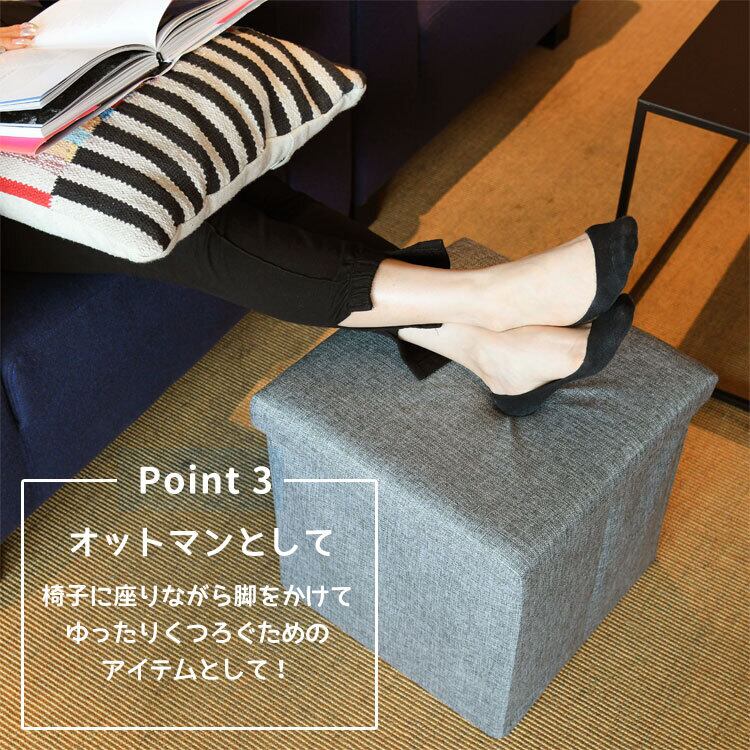 収納ができるスツールボックスとしてだけでなく、足をかけるオットマンや