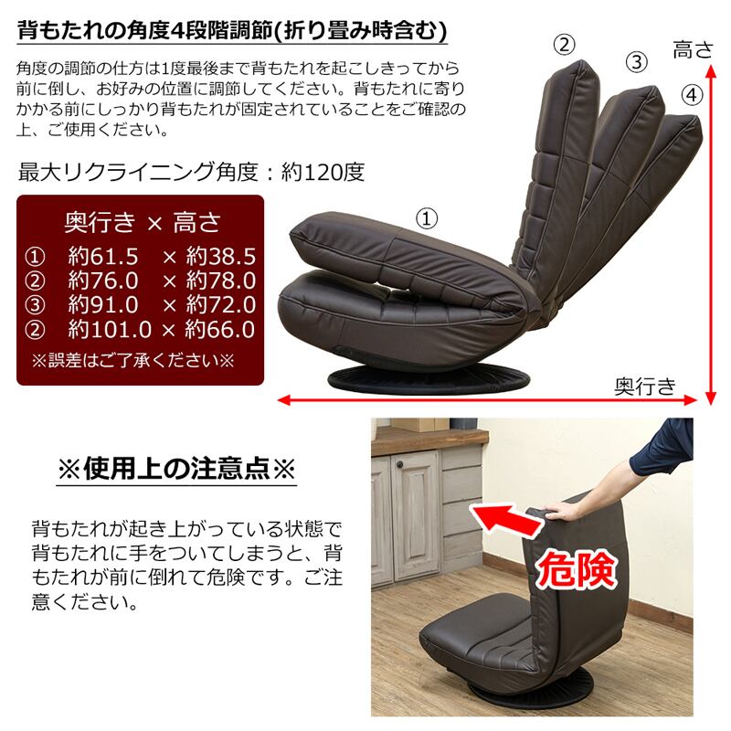 背もたれを完全に折りたたんだ状態を含め4段階の角度調節可能です(最大約120度倒れます)