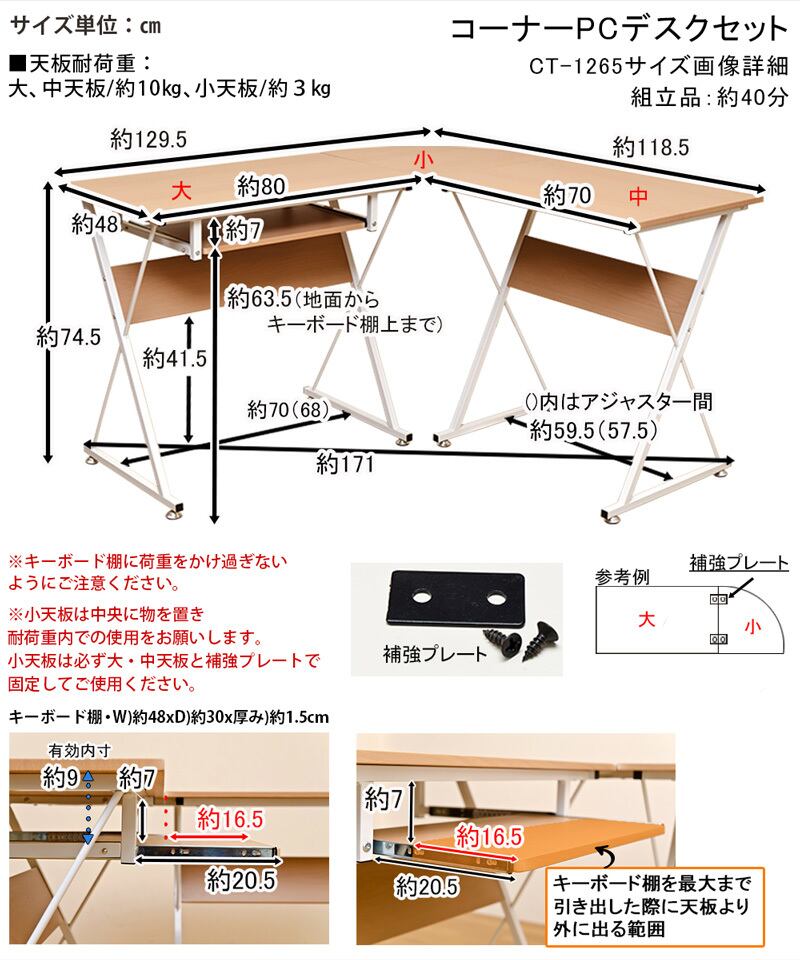 天板耐荷重:〔大〕約10kg前後〔中〕約10kg前後〔小〕約3kg