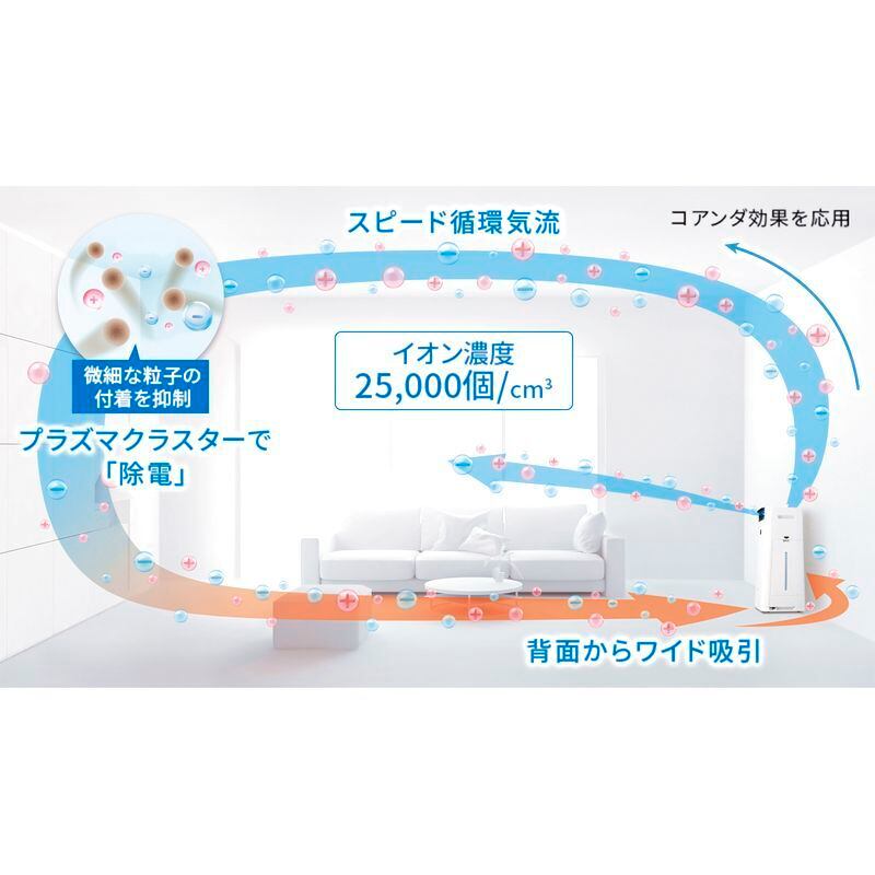 空気清浄・花粉にもプラズマクラスター・遠くのホコリも素早く吸じん「スピード循環気流」・センサーで見張って賢く気流を制御「効果実感モード」・3つのフィルターでしっかり脱臭・集じん・洗えないソファーやカーペットを狙って、消臭・除菌プラズマクラスターパワフルショット加湿・AIでかしこく加湿・給水回数 最大1/2削減・最適な加湿制御を自動判別シャープ独自の空気清浄化技術、プラズマクラスター25000搭載
