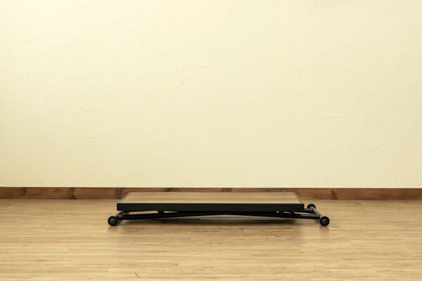 天板を下げる際はレバーを持ち上げながら天板中央より外側(回転するキャスター側)に荷重をかけて下さい